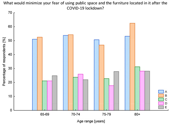 The ideas that could minimize the feeling of fear when using the public space after the lockdown, with regard to the age of respondents. A—visible information that the furniture is made of antibacterial materials or covered with an antibacterial coating; B—visible information about when the furniture was last cleaned; C—single furniture for sitting in the parks located 1.5–2 m away from each other; D—1.5–2 m zone markings to help to make it easier to keep a safe distance between people; E—displays with the number of people currently staying in the park, library, museum, and office, in relation to the size of the object Source: Authors’ own elaboration based on the performed survey research.
