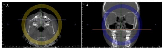 Figure 1. Example of a CBCT record: (A) axial view; (B) frontal view. - In the frontal view, by leveling the horizontal plane with the palatal plane (Figure 1B).