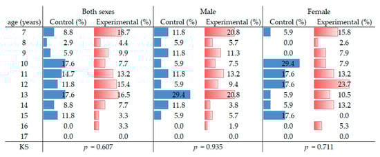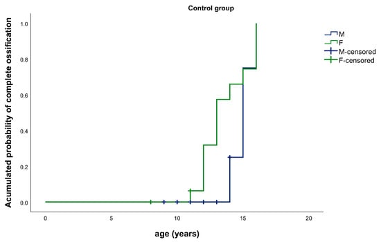 In this study, the median time for complete ossification of the SOS was, for males, 15.0 years for both the experimental (CI95% [14.0, 16.0]) and control groups (CI95% [14.2; 15.8]). There were no statistically significant differences between both groups (p = 0.806). The results for females were 14.0 years for the experimental group (CI95% [12.7, 15.3]) and 13.0 years for the control group (CI95% [11.9; 14.1]). There were no statistically significant differences between both groups (p = 0.565) (Figure 4 and Figure 5).