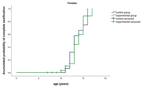 Kaplan–Meier graphic. Median age for complete ossification of the spheno-occipital synchondrosis (SOS): experimental group (green) vs. control group (blue) in females.