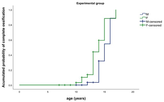 Kaplan–Meier Graphic. Median age for complete ossification of the SOS: experimental group, males (blue) vs. females (green).