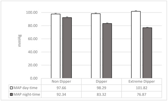 Furthermore, they recorded whether they were out of bed during the night (e.g., to use the bathroom) and the relative awake time. This strategy allows excluding the “out-of-bed” records of the ABPM from the data. Another exclusion criterion for the measurements was the presence of SBP data greater than 240 mmHg or lower than 70 mmHg or DBP data higher than 150 mmHg or lower than 40 mmHg. The ABPM dataset included in the analysis should have at least two-thirds of the SBP and DBP measurements during both the daytime and the night-time periods [25]. However, no participants in the study reported invalid data. The ABPM recordings allow calculating the mean arterial pressure (MAP) of wake and sleep through the formula MAP = (SBP + (2 × DBP))/3, and dipping ratio was assessed by the ratio between sleep MAP and wake MAP [26].