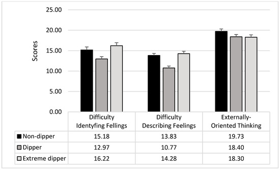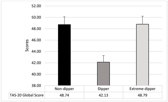 The ANOVA on TAS-20 global score showed a significant difference among groups (F2,207 = 8.45; p = 0.0003; pƞ2 = 0.08); dippers showed lower levels of alexithymia than both non-dippers (F1,207 = 12.57; p = 0.0005) and extreme dippers (F1,207 = 12.77; p = 0.0005), while there were no differences between non-dippers and extreme dippers (F2,207 = 0.001; p = 0.98) (see Figure 3).