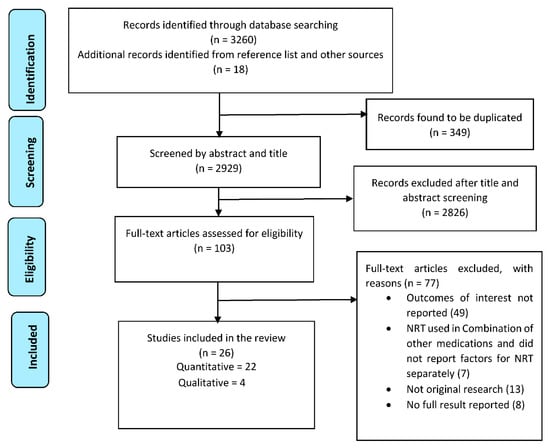 - Mersha, A.G.; Gould, G.S.; Bovill, M.; Eftekhari, P. Barriers and Facilitators of Adherence to Nicotine Replacement Therapy: A Systematic Review. 2020. Available online: https://www.crd.york.ac.uk/prospero/display_record.php?ID=CRD42020186621 (accessed on 29 November 2020).