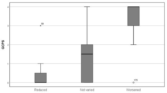 The 38 subjects that reported a worsening of TMD symptoms during the quarantine showed a significantly higher depression score (2.53 + 0.85 vs. 1.87 + 1.63, p < 0.05), a non-significant mean somatization score (2.10 + 0.76 vs. 1.90 + 1.21, p > 0.05), and a significantly higher GPCS class (median 4 vs. 3, interquartile range = 1, p < 0.01) (Figure 1); the age group is not significant (median age group 40–60, range = 2, p > 0.05), but those whose pain had worsened showed lower education (median = high school for worsening patients, college education for the other groups, p < 0.01). Sex was not a significant predictor of worsening conditions. The score of PSS was found to increase in the subject that reported a worsening of their symptoms in the last three months (Figure 2).