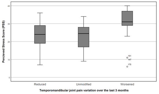 Perceived Stress Scale score (PSS) in relation to temporomandibular joint pain variation over the last three months. The box represents the interquartile range, and the black line represents the median and the confidence interval. Subjects #147, #151, and #175 showed outlier values.