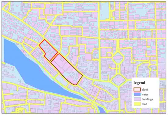 Part of the study area, the purple area, is the buildings; the study unit is a block composed of buildings, as shown in the red border area in the figure. The blue area is the water, and the yellow area is the road, which will be removed during the study.
