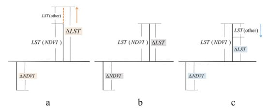 Analysis of the influence of other factors on the cooling of vegetation. (a) Other factors positively impact the cooling effect; (b) other factors negatively impact the cooling effect; (c) other factors have no impact on the cooling effect. Land surface temperature (LST) (normalized difference vegetation index (NDVI)) represents the LST impacted by NDVI. LST (other) represents the LST impacted by other factors.