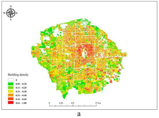 Both building density and building height certainly affect LST. All blocks in the study areas were divided into different groups according to different building heights, including high-rise of 9 or more floors, middle-rise of 4–9 floors, and low-rise of 1–3 floors. Then, the building density and LST of all blocks were counted and input in SPSS software for correlation analysis.