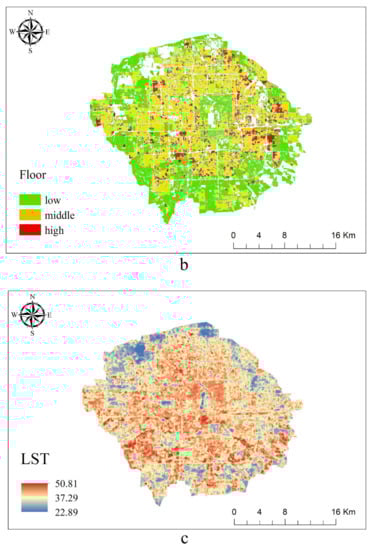 The scattered distribution of buildings with high rises can facilitate LST mitigation. Densely distributed buildings with low rise can easily become the largest heat source in a city [,]; we later explore possible limitations. In the current literature, scarce research has investigated influential factors of urban thermal environment on a microscale, especially regarding the shape, materials, and distributions of buildings. The influence of landscape configuration and diversity factors on LST is relatively weak and can be easily concealed by the influence of landscape components [,,]. Nevertheless, the characteristics and distributions of buildings within a city are important factors that determine heat transfer. Unraveling how urban morphology influences urban thermal environment intensity is paramount given the human health consequences associated with the continued growth of urban populations in the future []. The local climate and landscape should be considered to eliminate urban thermal environment hazards in future urbanization processes [].