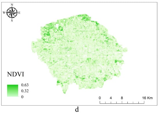 The land surface information, including the spatial distribution of LST, building density, building height, and the NDVI index, were reported in the figure by ArcGIS 10.2 (Figure 5). Comparing the building density with the LST, it was found that the building density gradually decreased from the center to the periphery of the study area, and the LST maintained a synchronous change. The LST in the south was higher than the LST in the north, which may be related to the distribution of more water in the north (white area in Figure 5). Further, there were more train stations and airports in the south, which had a positive effect on LST []. Moreover, there were more low-floor buildings in the south of the study area and more middle- and high-floor buildings in the north. Building height had a certain negative correlation with the land surface temperature [,]. Comparing LST and NDVI, the LST of the region with high NDVI value was smaller, as shown in the blue region.
