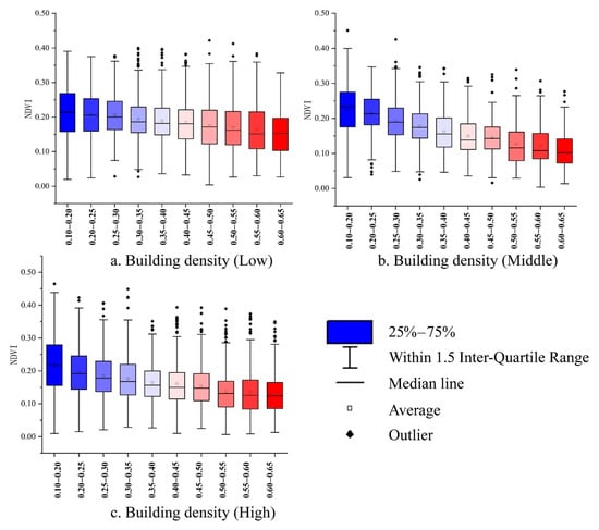 The area of green space is important for urban construction during urban planning, providing a comfortable environment for human beings and regulating the urban climate []. However, the distribution of buildings impacts the distribution of urban green space, where the building density is higher, and the vegetation is generally less distributed. Therefore, the building distribution could not be ignored when discussing the cooling effect of vegetation. Because of the height and density characteristics of the buildings, the NDVI in the sample points was classified and counted (Table A1 and Table A2 in Appendix A). We counted the NDVI value of the sample points in each group and selected the area within the quartile as the vegetation distribution of the group through box-plot analysis.