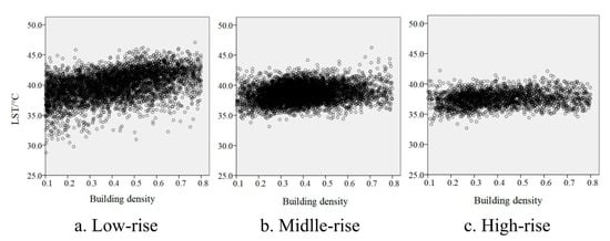 The significant positive correlations between building density and LST appeared on different building height zones, and the slope of linear relationships gradually reduced from low-rise to high-rise (Figure 7).