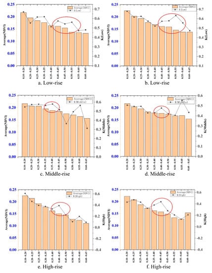 The k(high) and NDVI in Figure 8e,f had the same changing trend. Only when the building density was 0.35–0.5, the k(high) was higher than NDVI.