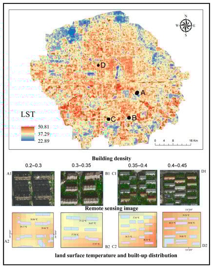 Four selected sample points in different building density: (A) 0.2–0.3, (B) 0.3–0.35, (C) 0.35–0.4 and (D) 0.4–0.45. (A1–D1) high-resolution imagery; (A2–D2) LST.