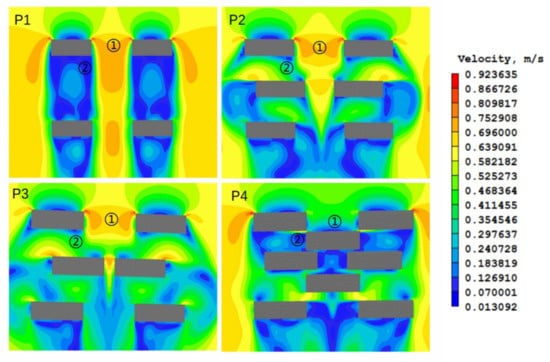 Point 2: The comparison of P2, P3, and P1 showed that the uneven distribution of the building was employed to increase the wind speed inside the buildings. The comparison of P2, P3, and P4 showed that appropriate distribution of buildings was required; otherwise, too many buildings could cause wind speed to decrease or even stop (Table 2).