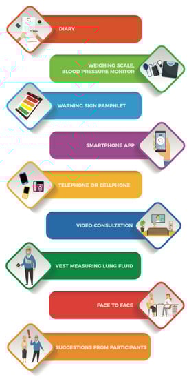 | Tools to consult with HCPs to identify HF symptoms | Face to face | Male, 59 years, college, welfare. “Nothing can replace to meeting in person. All the other things can only be supplemental. There are a lot of signs that are not possible to transfer by phone such as facial expressions and eye contact.” | |