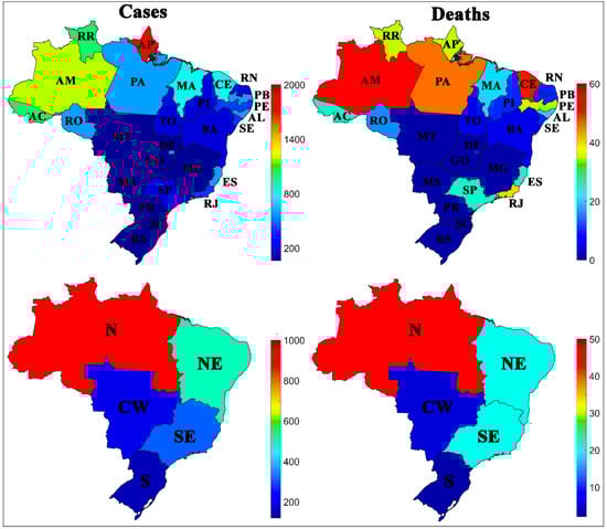 Figure 1 shows the number of cases and deaths accumulated by Brazilian states and regions per 100,000 inhabitants. All states belonging to the South (S) and Central-West (CW) regions of the country had the lowest rates of cases and deaths by COVID-19 recorded, an average of 180 cases and 4 deaths per 100,000 inhabitants. Most of the Brazilian states with the highest rates of cases and deaths belong to the North (N) region, an average of 954 cases and 43 deaths per 100,000 inhabitants, mainly represented by Acre (AC), Amapá (AP), Amazonas (AM), Pará (PA), and Roraima (RR).