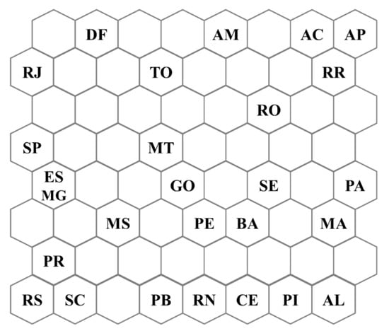 Distribution of Brazilian federative units according to the winning neuron. Where: Acre—AC; Alagoas—AL; Amapá—AP; Amazonas—AM; Bahia—BA; Ceará—CE; Distrito Federal—DF; Espírito Santo—ES; Goiás—GO; Maranhão—MA; Mato Grosso—MT; Mato Grosso do Sul—MS; Minas Gerais—MG; Pará—PA; Paraíba—PB; Paraná—PR; Pernambuco—PE; Piauí—PI; Roraima—RR; Rondônia—RO; Rio de Janeiro—RJ; Rio Grande do Norte—RN; Rio Grande do Sul—RS; Santa Catarina—SC; São Paulo—SP; Sergipe—SE; Tocantins—TO.