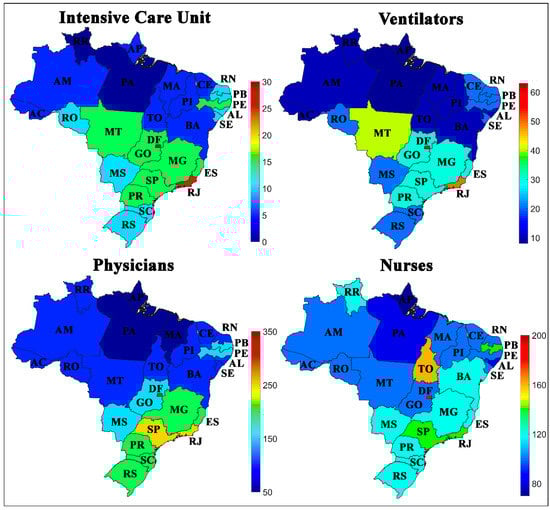 Health data from public and private institutions, such as the number of physicians, nurses, ventilators, and Intensive Care Unit (ICU) beds for COVID-19 in each state, were obtained from the IBGE []; available in https://mapasinterativos.ibge.gov.br/covid/saude/.