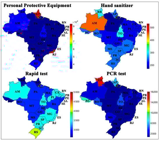 The Federal Government of Brazil transfers financial resources, supplies, and equipment for structuring health services in the country to combat or treat patients affected by COVID-19. The MS frequently updates a panel of inputs considered essential, distributed to each Brazilian state: Influenza vaccination—H1N1 and H3N2 (distributed and applied), drugs (chloroquine and oseltamivir), COVID-19 tests (rapid and reverse-transcriptase polymerase chain reaction—RT-PCR), hand sanitizer per liter, and Personal Protective Equipment—PPE (surgical masks, N95 mask, gowns, gloves, glasses, face shield, caps, and sneakers) []. These data were obtained on June 13, 2020, at https://covid-insumos.saude.gov.br/paineis/insumos/painel.php.