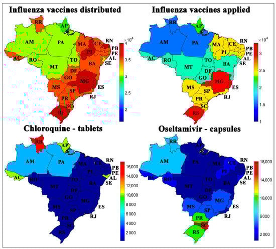 Geographical distribution of influenza vaccines distributed, influenza vaccines applied, chloroquine tablets, and oseltamivir capsules available in Brazilian states per 100,000 inhabitants.