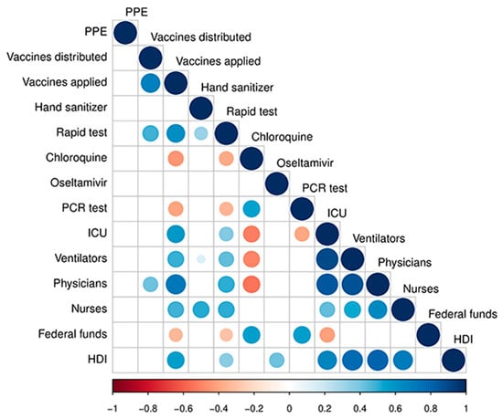 Possibly, the HDI was the main measure responsible for the separation due to its high correlation with the other variables. It is noteworthy that this index relates to health (life expectancy), education (adult literacy index and levels of education), and income (GDP—gross domestic product—per capita). Thus, it is possible to observe the correlation of the HDI in Figure 7, with other variables, such as ICU (Figure S1), ventilators (Figure S2), doctors (Figure S3), and nurses (Figure S4).