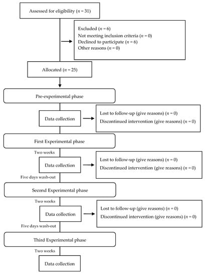 Thirty-one eligible volunteers were recruited for the double-blind three-treatment crossover trial. Six volunteers refused to participate for personal reasons. Twenty-five subjects were used in this study (9 females and 16 males, aged 20 to 58). The protocol consisted of a pre-experimental phase and 3 experimental phases of 14 days, each followed by a 5-day wash-out interval (Figure 1) [,,,].