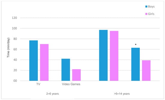 Time watching TV and playing video games by boys and girls in the two age groups. * Statistically significant differences (p < 0.05) for the comparison of video games between boys and girls.