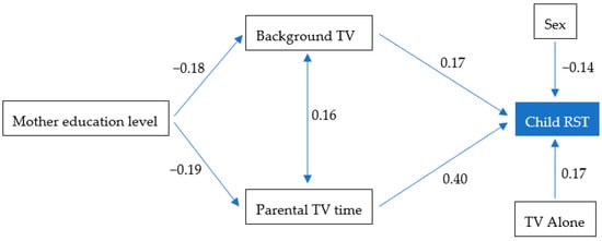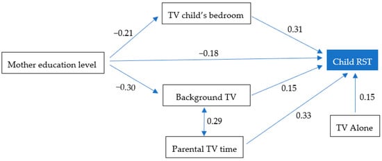 For the older group (Figure 3), maternal education level had an indirect effect on RST via the presence of a background TV (β = −0.03, p < 0.01) and parental TV time (β = 0.08, p < 0.01). Children watching TV alone (β = 0.17, p < 0.01) and sex (β = −0.14, p < 0.01) also affected RST.