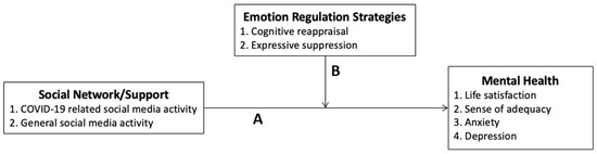 Previous studies have shown a positive relationship between cognitive reappraisal and life satisfaction, and a negative relationship between expressive suppression and life satisfaction [31]. Moreover, cognitive reappraisal was negatively associated with anxiety and depression, while expressive suppression was positively related to anxiety and depression [32,33]. However, most of those studies focused on the direct relationships between emotion-regulation strategies and mental health, while none of them has considered the possible influences of emotion-regulation strategies on the relationships between general public’s diverse social media activities and mental health.
