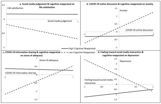 As shown in Table 4, with everything else being equal, among people with higher levels of cognitive reappraisal, the negative relationship between social media judgement and life satisfaction was reduced and even close to none (β = 0.113, p < 0.05). The positive relationship between COVID-19 information sharing and sense of adequacy was somewhat decreased in people with higher cognitive appraisal levels and even close to none (β = −0.295, p < 0.01). The negative associations of feeling toward COVID-19 information (β = 0.135, p < 0.05) and feeling toward social media interaction (β = 0.328, p < 0.001) with depression were reduced and even became positive when people holding a higher cognitive reappraisal score; meanwhile, the positive associations of social media dependence (β = −0.225, p < 0.05) and social media self-expression (β = −0.133, p < 0.05) with depression became weaker and even reached none. Last, the positive associations of COVID-19 online discussion (β = −0.193, p < 0.05) and social media belongingness (β = −0.277, p < 0.05) with anxiety were diminished and even close to none for people with higher cognitive appraisal levels; in comparison, the negative relationship between feeling toward social media interaction and anxiety was decreased (β = 0.165, p = 0.05).
