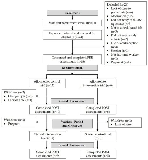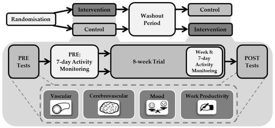 Study procedures were approved by the Liverpool John Moores University Ethics Committee (17/SPS/034) and adhered to the Declaration of Helsinki. This study was conducted between September 2017 to May 2018. This study was a randomised crossover trial design, consisting of two trials: Intervention and Control. Each trial lasted 8 weeks, in line with previous research using this e-health intervention [] and feasibility studies exploring interventions to reduce workplace sitting [,]. Trials were separated by a 6 week wash-out period. Participants were randomly assigned the order they completed trials by the principal researcher using computer-generated random numbers. During the Intervention trial participants used the e-health software to break up their workplace sitting, whilst in the Control trial participants did not have access to the software and were asked to maintain their normal workplace activity patterns. Participants and researchers were not blinded to group allocation. One week prior to commencing each trial (PRE), participants attended the laboratories at Liverpool John Moores University to complete measurements of vascular function, cerebrovascular function, mood and work productivity. Participants were then fitted with an activity monitor to measure their sitting, standing and stepping time, which was worn continuously for the next seven consecutive days. Immediately following this, the 8 week trial began. Sitting, standing and stepping time were assessed again during the final week of the trial (week 8). All other measures were then repeated directly after the 8 week trial (POST) (Figure 1).