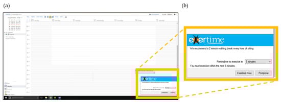 Once installed, the software was automatically initiated every 45 min as a prompt bubble appearing on the bottom right hand side of the participant’s computer screen, indicating it was time to take a break from sitting (Figure 2). The prompt frequency was based on previous studies using this intervention [,]. Participants could choose to either engage with or postpone the prompt. If engage was selected, the software displayed across the whole computer screen and could not be shut down, forcing the participants to click onto the software before being able to regain control of their computer screen. If postpone was selected, participants could temporarily delay the prompt for either 5, 10 or 15 min, for a maximum time of 15 min, after which the software was automatically activated. This function accounted for occasions where participants needed important access to their computer, such as a phone conversation or meeting. Participants were required to click the walking option to signify the beginning of their break and simultaneously initiate a timer. The break duration was self-selected. However, participants were advised via a message box presented on the screen to take a 2 min walking break. To end the break, the participant clicked to stop the timer, automatically logging the break duration in the software. The Exertime sequence then terminated and participants regained control over their computer screen. If a participant left their desk without the initiation of a prompt and did not lock their computer, the 45 min prompt timer was still active. The software could therefore activate without the participant being present. On these occasions, when participants returned to their desk, they could manually log the duration of time they had been active.