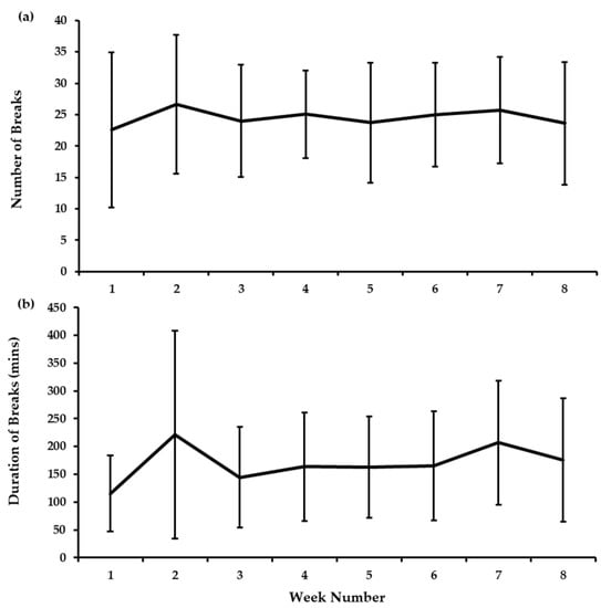 Weekly e-health software data for (a) the number of breaks recorded, and (b) the total duration of the breaks (mean ± SD).