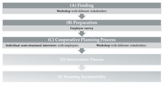 The research questions were answered by a mixed-methods design combining quantitative and qualitative data sources (see Figure 1). During (A) finding and (C) cooperative planning process, a qualitative research design was applied. The methods included workshops and individual semi-structured interviews with different stakeholders. A quantitative research design was applied during (B) preparation, and data were collected through an employee survey.