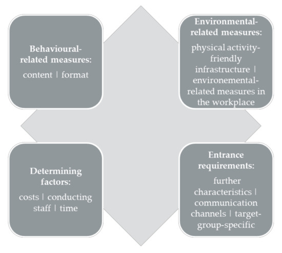 In consideration of further characteristics, statements made clear that a low-threshold integration into the workday should be ensured and is a benefit of physical activity measures in the workplace. Age was mentioned in the context of target-group specificity. The participants requested measures that take their individual age into account. With regard to the communication channels, the interviewees preferred a website that informs about the measures and allows registration. The statements regarding the utility of e-mail and newsletters were manifold. Referring to analogous media, the participants frequently mentioned posters and notices as a good opportunity.