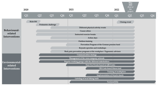 The framework for the multicomponent intervention is formed by a kick-off at the beginning of the implementation phase (March 2020) and a closing event at the end of the project (May 2022). A pedometer challenge will follow immediately after the kick-off. Several courses and outdoor measures, the content of which is based on the requests, as well as instructed exercise breaks during the lunchtime, will take place continuously over the project period. To promote the collaboration of different German social insurance companies, a prevention programme of the German pension fund will be integrated. Back pain prevention programmes will be offered and ergonomic advisors will tutor the employees directly in the workplace. At the infrastructural level, the implementation of bicycle stands and the labelling of local hiking trails shall be realized. QR-Code-based measures to promote stair use and a QR-Code-based fitness trail are further activities to establish on site. By scanning the QR-Codes, the user will be lead to different videos, which screen physical activity exercises. These exercises can be performed in the stairwell or outdoors (e.g., on a park bench). For this purpose, the QR-Codes will be installed in the stairwells and in form of a fitness trail (outdoors). Near the end of the project, multipliers will be trained. Multipliers are employees who will be educated to offer short exercise breaks for their colleagues in the workplace. Overall, the implementation of a professional communication strategy for physical activity promotion (including a web-based platform) is planned. On the organisational level, working groups with different stakeholders will take place regularly to discuss the status of the cross-company network and the multicomponent intervention. A network manager will be responsible for overall coordination. The elements mentioned will be available to all employees in the technology park, regardless of the employment with a company. They will be offered across the companies so that every company has the opportunity to let its employees participate. The local exercise providers will realize the measures on site and the health insurance provider will provide financial support.