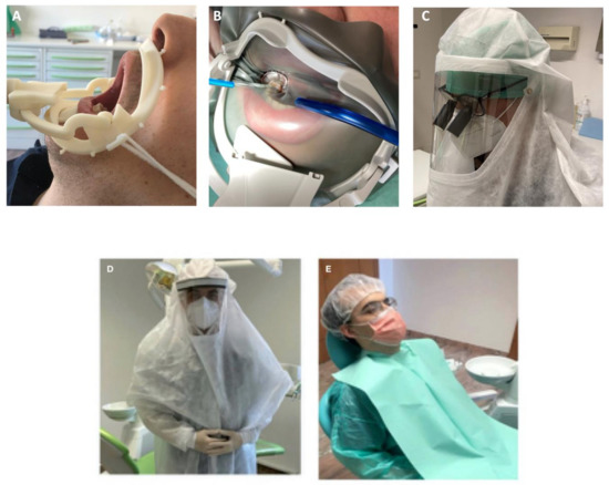New solutions to prevent operator and patient’s contamination. (A) Preliminary version of resin 3D-printed device dental dam arch with a sliding suction cannula connected to the wider bore of DCU suction pump, designed during Covid-19 emergency to prevent aerosol diffusion of ultrasonic devices and burs. This system may be used for all aerosol-generating procedures, with or without dental dam sheet. (B) Commercial dental arch dam now in use in the Dental school to prevent water-saliva aerosol diffusion. The device differs from the prototype as it was designed with a wider operative area, having an easier access to the more distal teeth. It may be reused after heat sterilization cycles at 121 °C. (C) Individual waterproof sprayhood with polycarbonate transparent area which may be disinfected and cold sterilized. This device may be used in association with surgical loupes. Ventilation holes are present in the posterior area, in correspondence to the operator nape to avoid fog-up. (D) Operator equipment used during COVID-19 emergency and currently used at the moment in Bologna dental schools and dental clinics, constituted of a surgical sterilizable sprayhood, N95 respirators and sterilizable waterproof suits. (E) Patient vestment to avoid cross contamination during dental procedures.