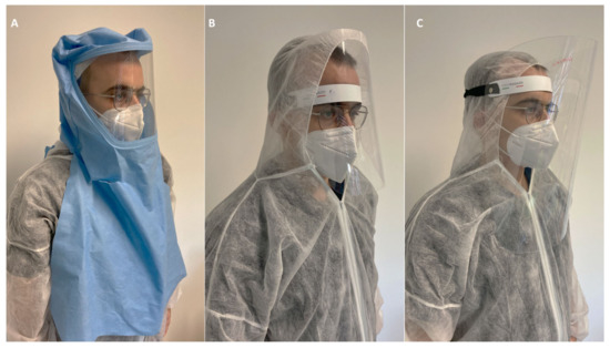 Different models have been recently developed by many companies. Sprayhoods and similar devices such as surgical shield helmets are recently developed to prevent any contact of (infected) droplets with eyes and nose mucosa of operator and to avoid any particles inhalation (Figure 2C).