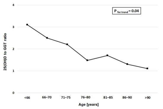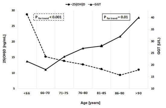 In addition, the rate of more severe forms of vitamin D deficiency was more prevalent in patients with GGT greater than 19 U/L. With advancing age, a significant increase in GGT levels and decline in 25(OH)D levels were observed (Figure 1).