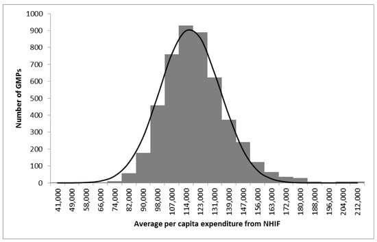 Distribution of average per-capita expenditure among the Hungarian general medical practices (GMPs) studied with the reference normal distribution curve.