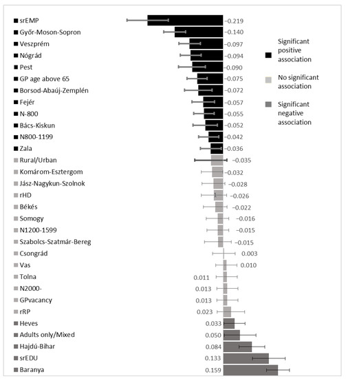 According to the standardized linear regression coefficients, srEMP (β = −0.219, 95% CI: −0.277; −0.159) had the strongest negative effect on spending, followed by being located in Győr-Moson-Sopron county (β = −0.140, 95% CI: −0.172; −0.108) and Veszprém county (β = −0.097, 95% CI: −0.128; −0.065). The strongest positive effect on spending came from being located in Baranya county (β = 0.159, 95% CI: 0.126;0.193) followed by srEDU (β = 0.13, 95% CI: 0.085;0.181). The nonsignificant effect of the Roma population proportion was associated with a very small standardized linear regression coefficient (β = −0.023, 95% CI: −0.017; 0.063). (Figure 2)