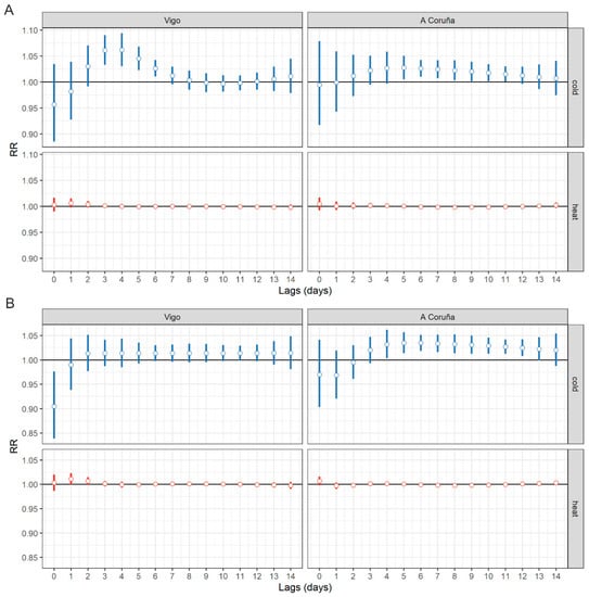- Iñiguez, C.; Royé, D.; Tobías, A. Contrasting patterns of temperature related mortality and hospitalisation by cardiovascular and respiratory diseases in 52 Spanish cities. Environ. Res. 2020, 192, 110191. [Google Scholar]