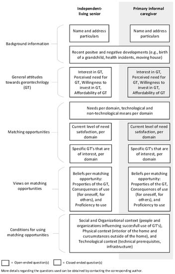 In so-called “science-to-practice projects”, in co-creation between researchers, older adults, care professionals, and teachers, we translate relevant scientific knowledge into daily care practice and education. Within these projects, based on our research findings, we develop tools and educational programs that can directly be applied in daily care practice, in vocational education, or for training on the job purposes. In general, these tools aim to help care professionals to analyze and evaluate their daily care giving practice and to pay attention to perspectives of older adults, which contributes to more PCC. An example of a “science-to-practice project” is the practical evaluation tool which is useful for care practice to evaluate and improve geriatric rehabilitation care []. This evaluation tool has been developed based on our previous scientific insights about evaluation of integrated care interventions and is described in detail elsewhere []. Another example is the Gerontechnologies Matchmaking (GTM) tool (see Figure 1) [] that is based on our scientific insights about why older adults use or do not use digital technology []. The GTM tool was co-created with technology consultants and aims to help professionals to match the most appropriate technology at the right time with the needs of the older adult. Moreover, it structurally involves the perspective of informal caregivers, because they are important in the lives of older adults in general and regarding technology acceptance. The common boxes in Figure 1 depict objective information that is the same for the older adult and the informal caregiver, while the doubled boxes represent the topics in which the attitude and experience of both parties might differ. In the development of the GTM tool, we used our scientific insights about origins and consequences of technology acquirement by older adults and we observed the matchmaking dialogues between technology consultants and older adults. Together, these scientific and practical insights and observations were combined in the first version of the tool and thereafter drafted, tested and adapted. The approach has been described in detail elsewhere [].