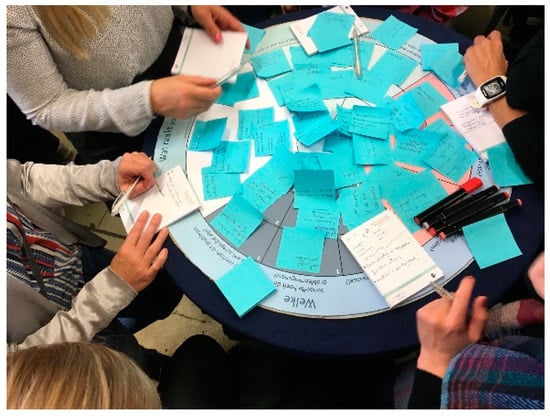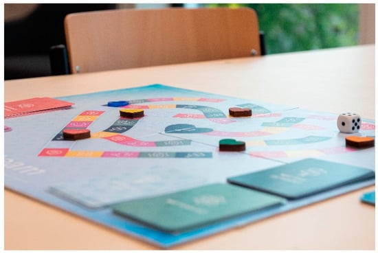 Furthermore, in line with our ambitions, we organized a national inspiration day (see Figure 2) exclusively for (student) nurses and caregivers about love, intimacy and sexuality among nursing home residents. Together with teachers of higher vocational education, we designed and facilitated this day. We offered 100 (student) nurses and caregivers the opportunity to be actively involved and to learn about the topic. We invited them to design innovations for facilitating intimacy and sexuality in the nursing home in a person-centered way. All innovations were presented in an exposition. Visitors of the exposition selected the two most promising innovations: a board game (see Figure 3) and a leaflet. Both innovations are currently further fine-tuned, prototyped, and tested in care practice. This is conducted in co-creation between the ACC, the involved institution for higher vocational education, and the involved current and student professional caregivers. The board game aims to stimulate and facilitate conversation among team members regarding intimacy and sexuality in the nursing home. The leaflet aims to inform older adults who are going to live in a nursing home that not living together does not have to mean not being together—it is an invitation to bring this subject to the table. These products will become available for our partnership organizations, but also for other nursing homes in the Netherlands.