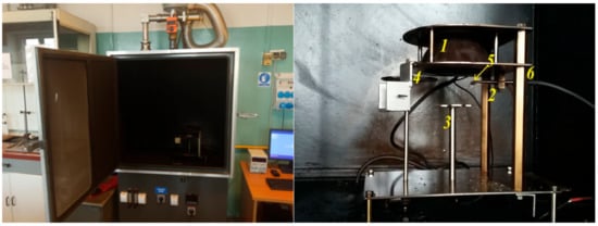 Two configurations were adopted for the needs of the tests, namely the use of a piloted flame to ignite thermal decomposition products and without it. The value of external density radiation heat flux was adopted at the level of 25 kW/m2 (with or without piloted flame) and 50 kW/m2 (without piloted flame) according to the standard measurement conditions []. Figure 1 shows the research smoke chamber. The value of the external heat flux applied to the surface of tested samples was selected according to requirements of standard and testing conditions applicable for the materials to be used as lining on ships or in railways. One or two ignition sources were applied in the tests, one of them was an electric radiator used in each test to obtain the chosen external heat of flux—the other was a piloted flame. It means that tested materials were burnt in an external heat of flux with or without of piloted flame.