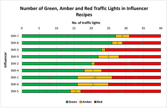 SMI-7 had the highest number of green lights (27/40); SMI-5 had the lowest (14/40). Similarly, SMI-7 had the lowest number of red lights (9/40), and SMI-5 the highest (23/40) (Figure 3). For eight influencers, red lights were mostly for fat/saturated fat. Green lights were mostly for sugar. Of the 90 meals analysed, only eight were awarded four green lights. SMI-5 and SMI-9 had a meal that contained four red lights.