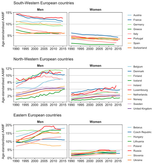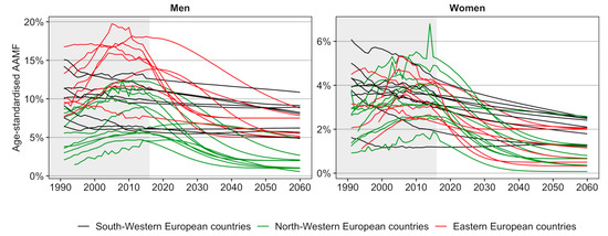 We observed for the 26 European countries studied, that women have always exhibited lower AAMF levels than men. This gender gap may be related to higher alcohol consumption levels and riskier alcohol consumption patterns (binge drinking, drinking of spirits) among men than among women [33]. These sex differences in alcohol consumption are generally explained by traditional gender differences in social roles (e.g., women are responsible for performing housework, while men are responsible for generating a labour market income) [34], but also by sex differences in strategies for coping with stress, with men being more likely than women to deal with stressful situations by consuming large amounts of alcohol [35,36]. Mainly for the latter reason, we do not regard it as likely that in the future AAMF levels for men will be lower than those projected for women.