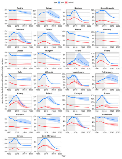 Alcohol consumption is an important public health challenge in Europe, as it substantially increases the risk of contracting many different diseases, including liver cirrhosis, alcohol use disorders, specific cancers, cardiovascular diseases, and infectious diseases, and the risk of sustaining (road/transport) injuries [1,2]. As alcohol use can have both acute and chronic health effects, it is a leading risk factor not just for disability, but for death [3,4]. Consequently, alcohol use has a large impact on (healthy) life expectancy [5,6]. Worldwide, Europe is the region with the highest levels of alcohol consumption: in 2016, an estimated 9.8 litres of pure alcohol were consumed per capita in Europe, compared to 6.4 litres worldwide [7]. Without alcohol-attributable mortality, national life expectancy levels in Europe would be, on average, 1.8 years higher among men and 0.5 years higher among women [8]. Thus, having a clear overview of past trends in alcohol-attributable mortality, and understanding how alcohol-attributable mortality is likely to further develop in the future, is highly relevant for society, and for health policy-makers in particular.